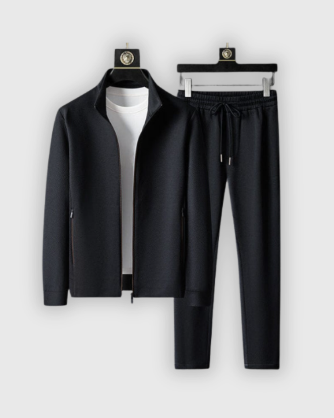 Ensemble de survêtement pour homme composé d’une veste zippée à col montant et d’un pantalon assorti à taille élastique. Il présente des bandes contrastées sur les côtés et convient à des activités sportives ou décontractées.
